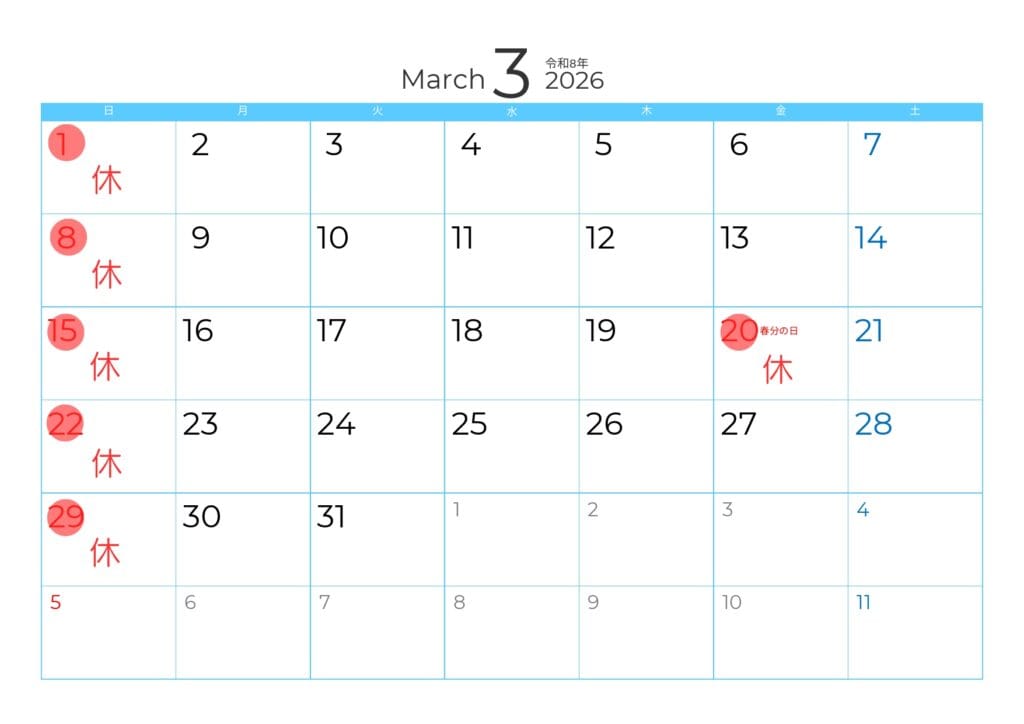 11日、23日の祝日、土曜日午後、日曜日は休業日となります。